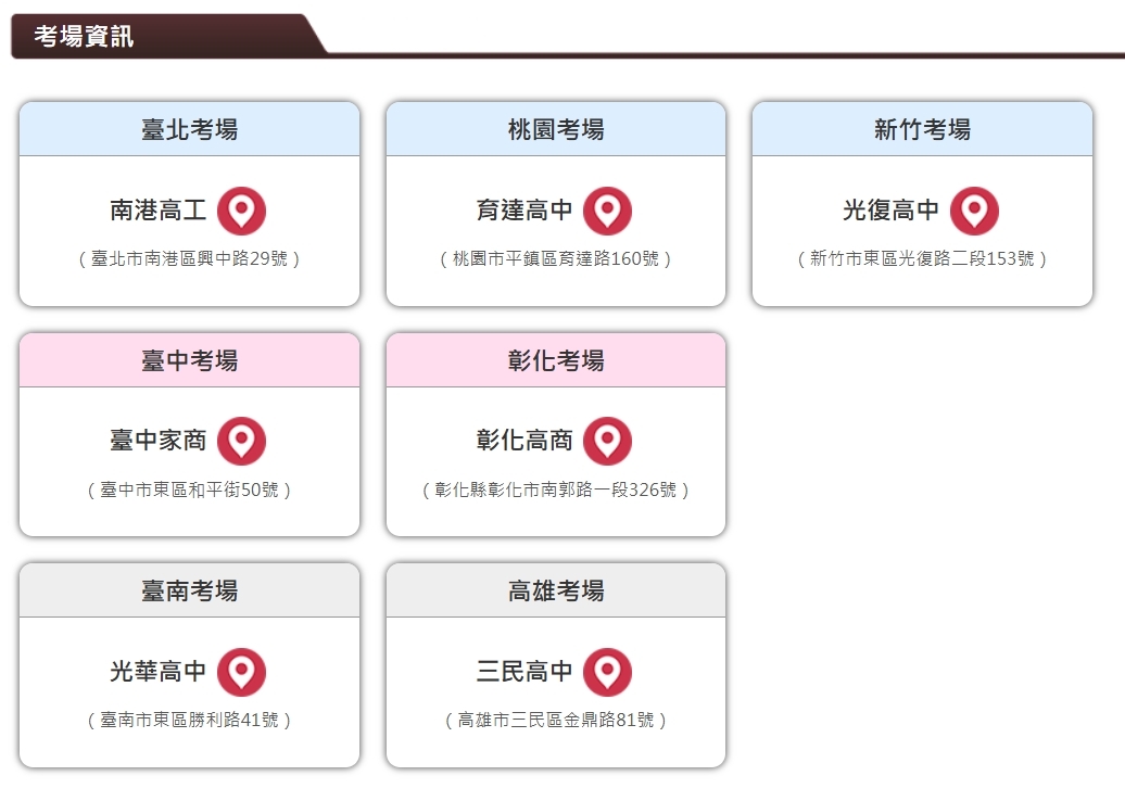 各考場皆【不提供停車】,請考生多加利用大眾交通工具,並提早前往考場準備。