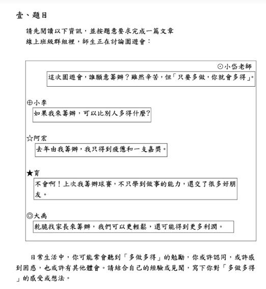 111年度國中教育會考於本月21、22日舉行,本屆寫作測驗的主題為「多做多得」,以師生對話框的方式呈現。此類以非連續文本作為引導的試題形式,在CWT全民中檢各等級中比例漸增,與國家考試的趨勢相符。在此分享本中心長年的命題、評閱經驗,以供考生掌握審題要訣。